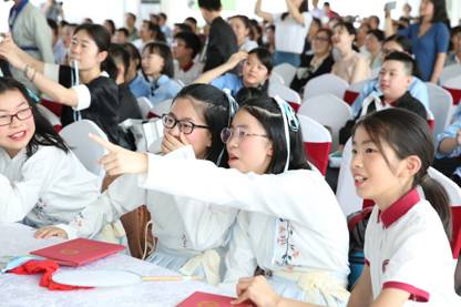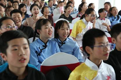 接下来的文艺汇演是孩子们精心准备的一份毕业汇报。既有充满个性的个人节目,如悠扬美妙的钢琴、小提琴演奏,挥洒自如的现场书画展示,清新动人的女生小合唱等等,又有四个班精心编排的集体节目:一班的男生小合唱《夜空中最亮的星》充满了青春的活力,女生合唱《大鱼》则让人感受到悠悠古风;二班的诗歌朗诵《再别康桥》充满深情,《蜀道难》则气势磅礴,震撼人心;三班同学集体编排的课本剧《城门立柱》讲述了商鞅变法的故事,演员们精彩的演绎让这个历史故事传神地呈现在了舞台上,给人以启发;四班同学在合唱中富有创意地加入了朗诵和武术表演,一曲《少年中国说》铿锵有力,满怀激情,让在场的观众们热血沸腾。在表演的过程中,整个会场笑声、掌声不断,家长和老师们都用赞许的目光注视着每个毕业生,让他们倍感自豪。