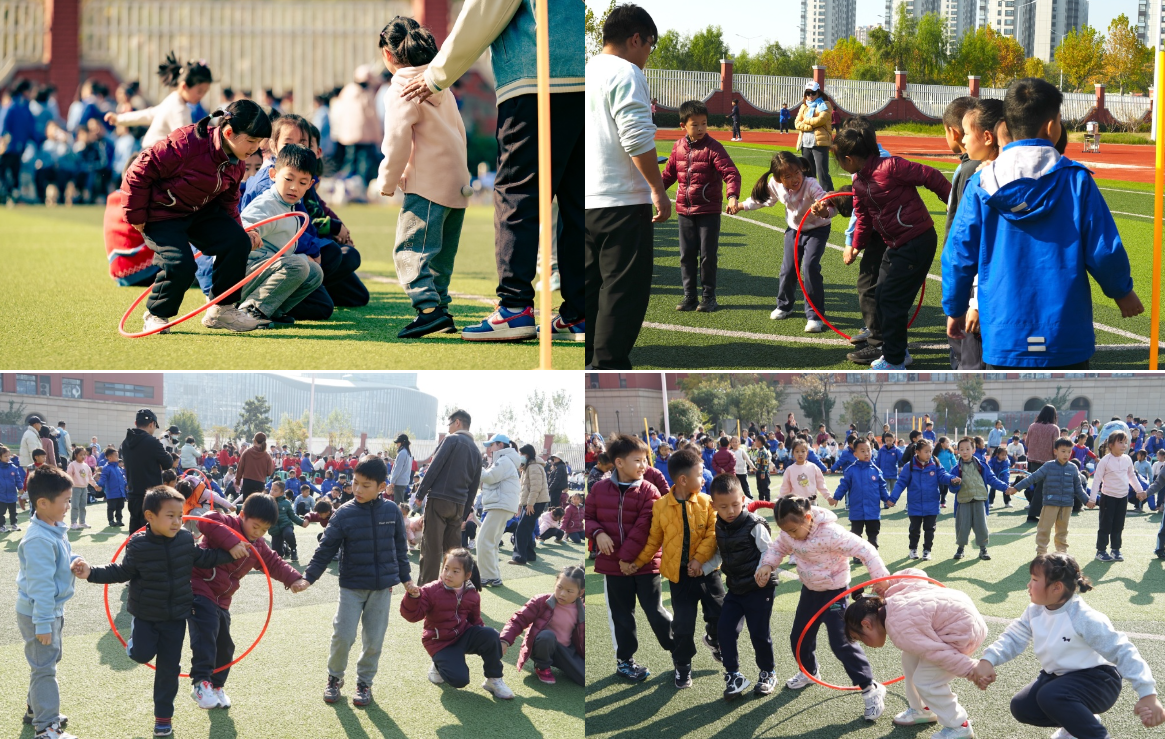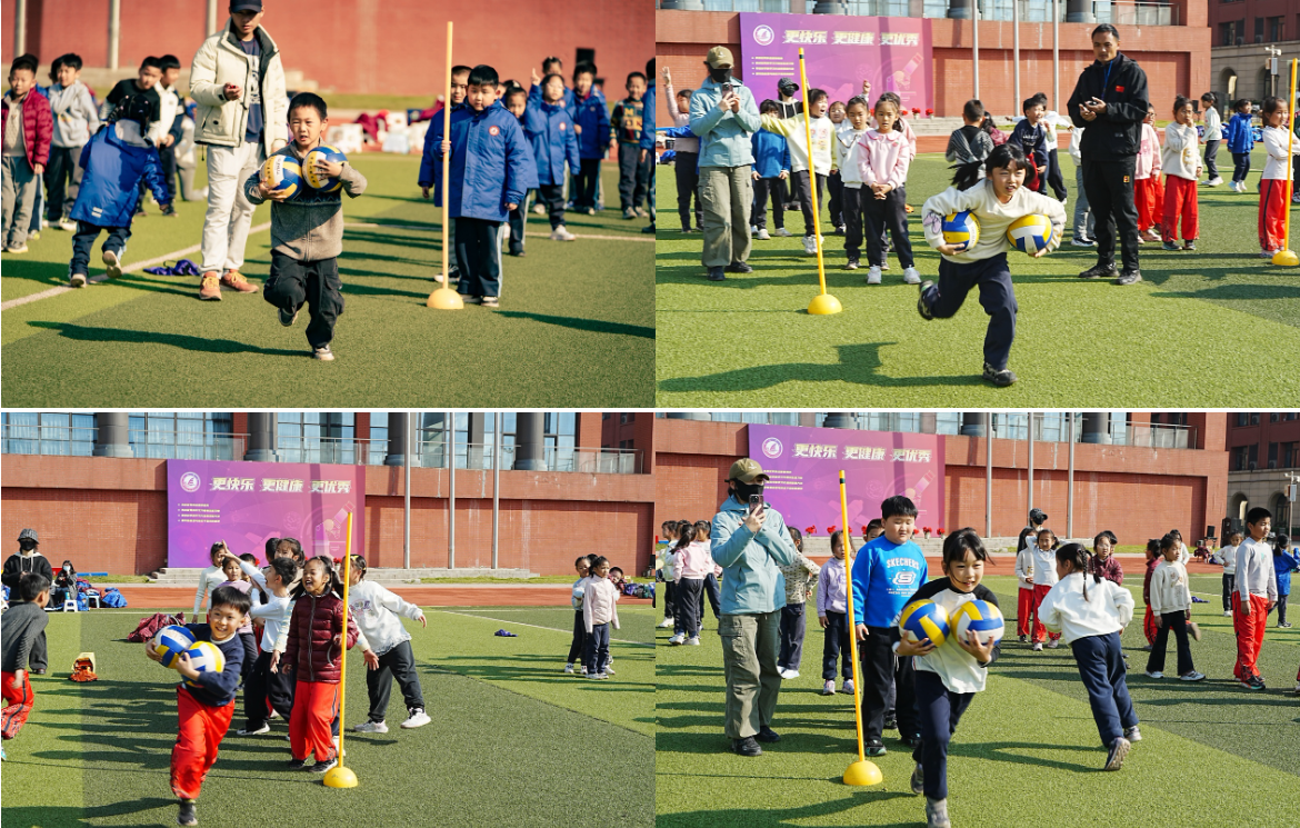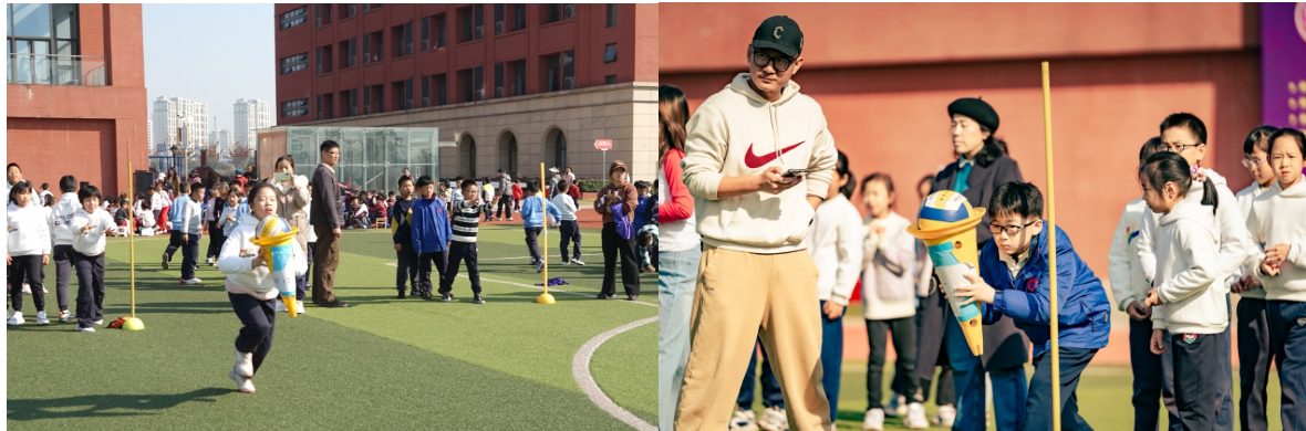 一、二年级的同学们化身 “运动小达人”,在“一钻到底” “翻物接力跑”等项目中努力拼搏。尤其是“夹球迎面接力赛”,真是紧张又有趣,大家小心翼翼地夹着足球,生怕掉落却又不甘落后,现场笑声与加油声此起彼伏。